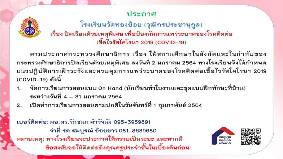 ประชาสัมพันธ์โรงเรียนวัดทองย้อย(วุฒิกรประชานุกูล) เรื่องการประกาศหยุดเรียนในช่วงสถานการณ์การระบาดของโรคติดเชื่อไวรัสโคโรนา 2019(COVID-19) S:0