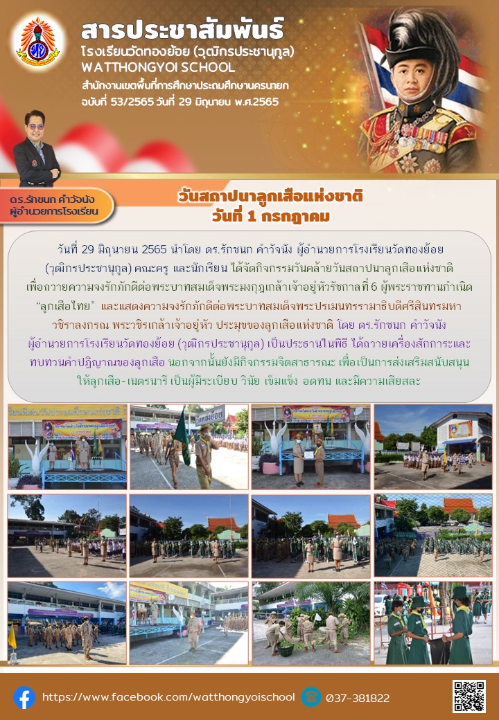วันที่ 29 มิถุนายน 2565 นำโดย ดร.รักชนก คำวัจนัง ผู้อำนวยการโรงเรียนวัดทองย้อย(วุฒิกรประชานุกูล) คณะครู และนักเรียน ได้จัดกิจกรรมวันคล้ายวันสถาปนาลูกเสือแห่งชาติเพื่อถวายความจงรักภักดีต่อพระบาทสมเด็จพระมงกุฎเกล้าเจ้าอยู่หัวรัชกาลที่ 6 ผู้พระราชทานกำเนิด“ลูกเสือไทย” และแสดงความจงรักภักดีต่อพระบาทสมเด็จพระปรเมนทรรามาธิบดีศรีสินทรมหาวชิราลงกรณ พระวชิรเกล้าเจ้าอยู่หัว ประมุขของลูกเสือแห่งชาติ โดย ดร.รักชนก คำวัจนัง ผู้อำนวยการโรงเรียนวัดทองย้อย (วุฒิกรประชานุกูล) เป็นประธานในพิธี ได้ถวายเครื่องสักการะและทบทวนคำปฏิญาณของลูกเสือ นอกจากนั้นยังมีกิจกรรมจิตสาธารณะ เพื่อเป็นการส่งเสริมสนับสนุนให้ลูกเสือ-เนตรนารี เป็นผู้มีระเบียบ วินัย เข็มแข็ง อดทน และมีความเสียสละ