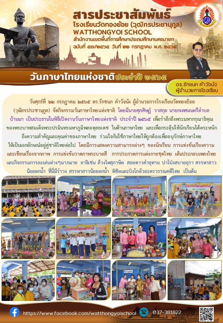 วันศุกร์ที่ 22 กรกฎาคม 2565 ดร.รักชนก คำวัจนัง ผู้อำนวยการโรงเรียนวัดทองย้อย (วุฒิกรประชานุกูล) จัดกิจกรรมวันภาษาไทยแห่งชาติ โดยมีนายศุภศิษฏ์ วาสกุล นายกเทศมนตรีตำบล บ้านนา เป็นประธานในพิธีเปิดงานวันภาษาไทยแห่งชาติ ประจำปี 2565 เพื่อรำลึกถึงพระมหากรุณาธิคุณของพระบาทสมเด็จพระปรมินทรมหาภูมิพลอดุลยเดช ในด้านภาษาไทย และเพื่อกระตุ้นให้นักเรียนได้ตระหนักถึงความสำคัญและคุณค่าของภาษาไทย ร่วมใจกันใช้ภาษาไทยให้ถูกต้องเพื่ออนุรักษ์ภาษาไทย ให้เป็นเอกลักษณ์อยู่คู่ชาติไทยต่อไป โดยมีการแสดงความสามารถต่างๆ ของนักเรียน การแข่งขันเรียงความและเขียนเรื่องจากภาพ การแข่งขันวาดภาพระบายสี การประกวดการแต่งกายชุดไทย เต้นประกอบเพลงไทย และกิจกรรมการละเล่นต่างๆมากมาย อาธิเช่น ล้วงไหสุภาษิต สอยดาวคำอุทาน ปาโป่งสบายอุรา สรรหาสาวน้อยตกน้ำ ที่นี่มีรำวง สรรหาสาวน้อยตกน้ำ พิชิตและบิงโกตัวละครวรรณคดีไทย เป็นต้น