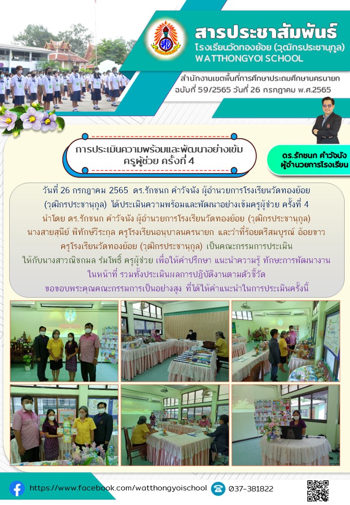วันที่ 26 กรกฎาคม 2565 ดร.รักชนก คำวัจนัง ผู้อำนวยการโรงเรียนวัดทองย้อย (วุฒิกรประชานุกูล) ได้ประเมินความพร้อมและพัฒนาอย่างเข้มครูผู้ช่วย ครั้งที่ 4 นำโดย ดร.รักชนก คำวัจนัง ผู้อำนวยการโรงเรียนวัดทองย้อย (วุฒิกรประชานุกูล) นางสายสุนีย์ พิทักษ์วีระกุล ครูโรงเรียนอนุบาลนครนายก และว่าที่ร้อยตรีสมบูรณ์ อ้อยขาว ครูโรงเรียนวัดทองย้อย (วุฒิกรประชานุกูล) เป็นคณะกรรมการประเมิน ให้กับนางสาวณิชกมล ร่มโพธิ์ ครูผู้ช่วย เพื่อให้คำปรึกษา แนะนำความรู้ ทักษะการพัฒนางาน ในหน้าที่ รวมทั้งประเมินผลการปฏิบัติงานตามตัวชี้วัด ขอขอบพระคุณคณะกรรมการเป็นอย่างสูง ที่ได้ให้คำแนะนำในการประเมินครั้งนี้